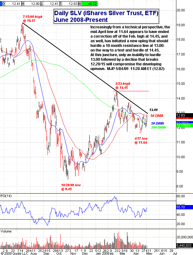 Increasingly from a technical perspective the mid-April low at 11.64 in the iShares Silver Trust ETF (NYSE: SLV) appears to have ended a correction off of the Feb high at 14.45 and as well as initiated a new upleg that should hurdle a 10-month resistance line at 13.00 on the way to a test and hurdle of 14.45. At this juncture only an inability to hurdle 13.00 followed by a decline that breaks 12.20/15 will compromise the developing upmove.