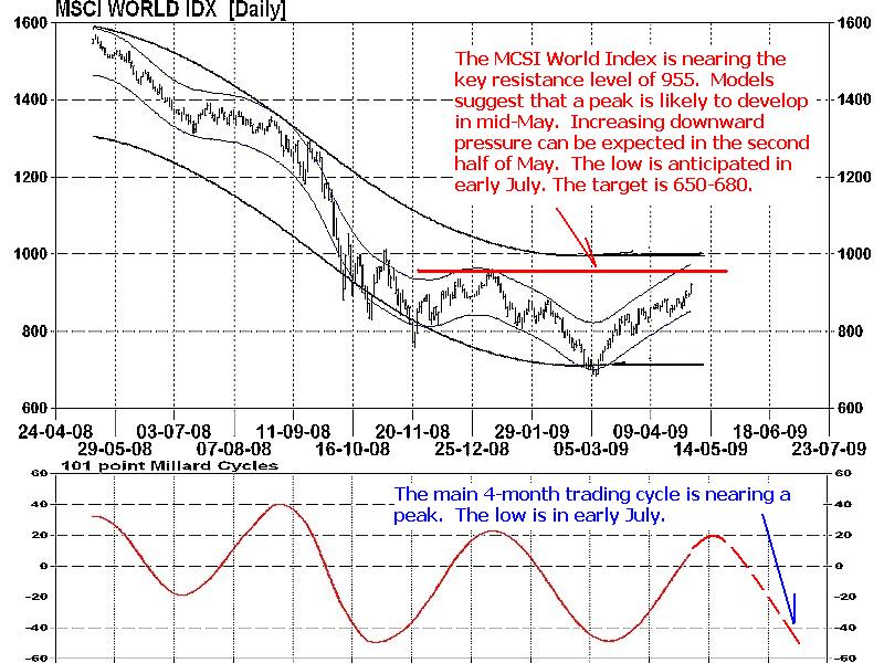 A review of the chart 1 illustrates that the MSCI World Index has been slowly advancing up to the key 955 resistance line. Monte Carlo simulation (refer to the chart in the April 22 Market Minute) stated that there was a 95% probability that the index will trade outside of the 903-1375 zone over the next 100 days. The main 4-month trading cycle is expected to reach a peak in mid-May. This would suggest another 1-2 weeks of upward movement is still possible.