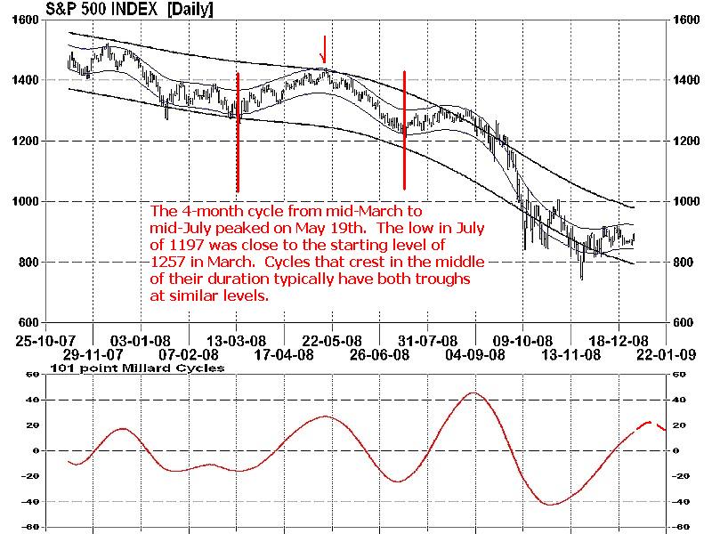 Models indicate that this current market is performing in a same pattern as the March-to-July 2008 cycle (Chart 3). After nine weeks of steady increases from the early March trough, the peak in that formation crested in mid-May. The final low in July 17 developed slightly lower than the March starting level. This trading action is a standard process with financial indexes. Market cycles that advance in the first half of their duration and peak in the middle, normally decline back to the original starting level in the second half.