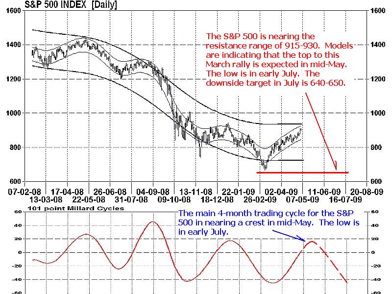 Bottom line: The chance of a top to this current March-to-July 4-month cycle increases greatly by mid-May. Models suggest the likelihood of a reversal of this advance should build by the second half of May. But as market patterns often repeat themselves, this coming low in July is likely to only be at or slightly below the early March levels.