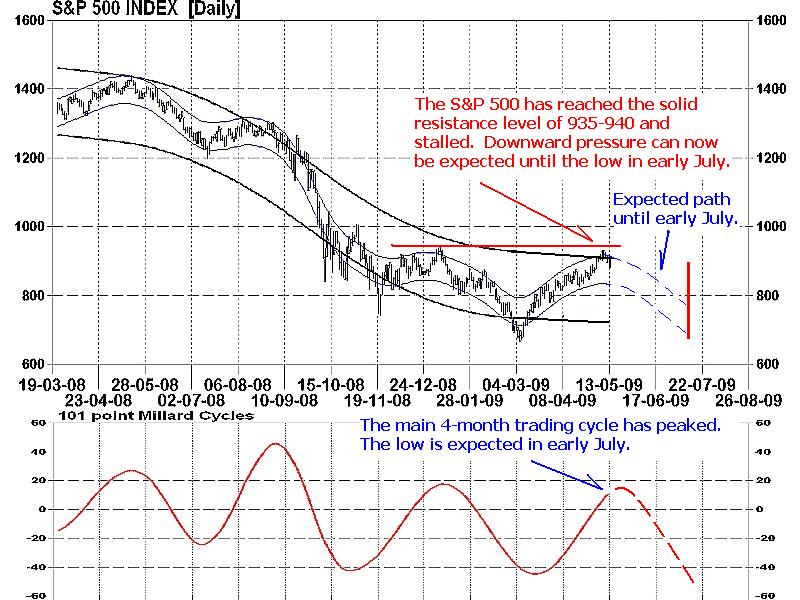 In the May newsletter, I indicated that major indexes were expected to retest their march lows by early July. Models were suggesting that the highest probability of renewed weakness could be expected in mid-May. Though the actual change in trend has not quite occurred, the bullish attitude and trading over the last 2-3 days for the benchmark S&P 500 has clearly shifted to a more bearish tone.