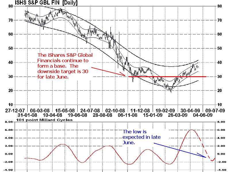 Models are indicating that the global financial sector continues to form a base and stabilize. As this industry group is a leading indicator to the broader Dow Jones World Stock Index, it suggests that a bottom for the DJWSI is close. Limited downward pressure can be anticipated in June as the iShares S&P Global Financial ETF (IXG) nears the next expected low in late June.