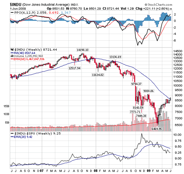 Given this strength the markets can readily advance another 20-30% before the issue of a new bull market is addressed. Clearly until the banking system and the real estate market is repaired there will be no new "bull" economy. What actually transpires remains to be seen. The most likely outcome is that the pure energy of momentum will propel prices forward until either the market or the economy "blinks".