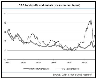 The chart shows the Commodity Research Bureau (CRB) foodstuffs price index (bold line) relative to the CRB metals index (thin line) over the past 28 years in real (inflation-adjusted) terms.