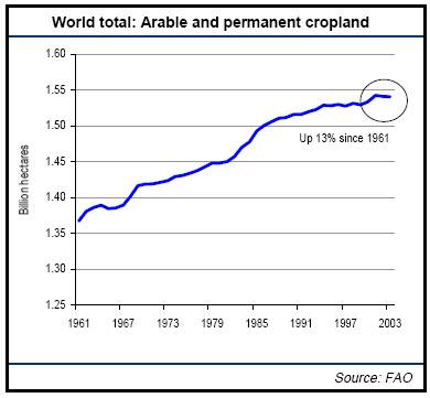 Whether the farmland was created by tearing down rain forests, converting pasture to crop producing land, or using technologically advanced seeds, chemical fertilizers, and irrigation to turn marginal farmland into more productive, the world is running out of ways to create more farmland.