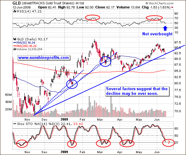 At the first glance, the situation on the gold market looks quite bullish. Gold has advanced substantially from April to June, and has been correcting since the beginning of this month. Corrections are to be expected on any market, and gold is no exception here, so until we see evidence that this correction is anything more than just that, we remain bullish in the long run. Right now the price of gold (and also the value of the GLD ETF) has closed at its long term support level (solid blue line), which generally indicates that a rebound is likely.