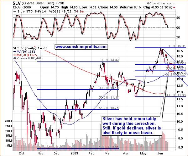 Additionally, previous bottoms were accompanied by particular signals from the stochastic indicator (as seen on the bottom of the gold chart). Several weeks ago I wrote about the RSI indicator as particularly useful in timing top on the precious metals market. Naturally - there is no perfect tool. RSI is not that useful in determining bottoms on the PM market, as it is the case with tops. Still, there are many more indicators than just the Relative Strength Index, and one of them proved to be particularly useful in estimating bottoms in the recent past. During the past several days most meaningful bottoms took place when stochastic indicator was below the 20 level and it started to rise (thus crossing its moving average) - I have marked these situations with red ellipses.