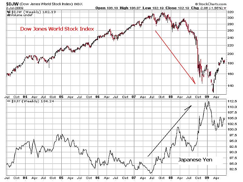 However, as of mid-2007, the 'free bank account' started to become more and more costly. The unwinding of the "Yen carry trade" in late 2007 spelled the end of the bull market. As the Yen began to accelerate upward in 2008, The Dow Jones World Stock Index plunged. Quite simply, the global equity markets began to fall when the tap was turned off to cheap money. Traders were now forced to buy back massive Yen short positions and sell assets to pay for it.
