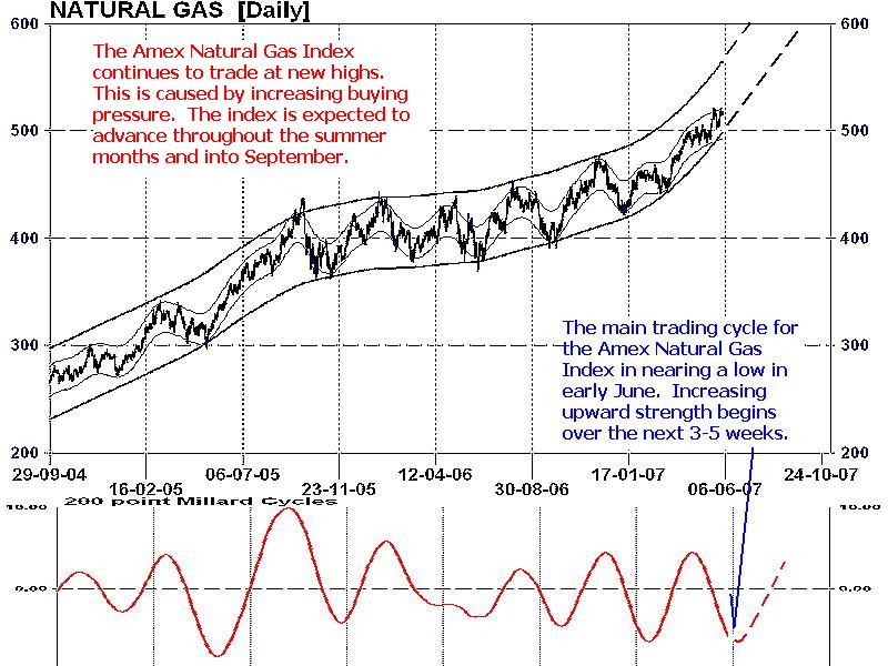 The Amex Natural Gas Index (symbol XNG) remains in a gradual escalating trend. This index of 15 gas producers and distributors (Chart 2) broke out of a 14-month consolidation in November 2006 and has pushed to new highs ever since. Technical evidence indicates on going upward pressure is anticipated in June and July which will translate into a projected target of 550 in 4-6 weeks.