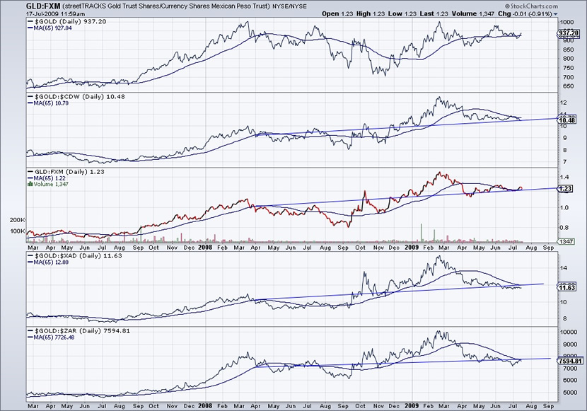 First we show the price of Gold against the other currencies, with a 65-day moving average, which can help us gauge an average price for a quarterly period. In every case, (including the US dollar Gold price) the moving average is at or above where it was at its peak in 2008. If you are producing Gold in Mexico (3rd from top) or Canada (2nd from top), then based on the local price, you are better off than at the peak in 2008. We should note that while Gold has rebounded in recent days, it needs to show better strength against currencies. Four of the five moving averages are trending down.