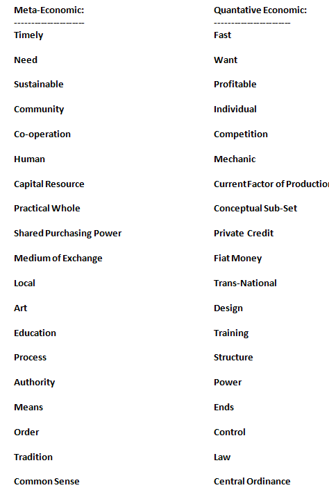To comprehend this "meta" concept, some examples of Meta-Economic mind-set principles V's those of Quantative Economics one are set out below: