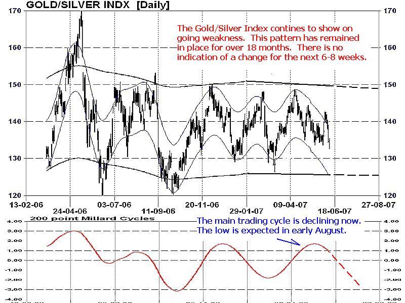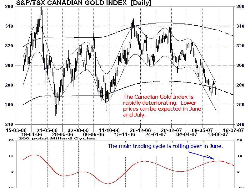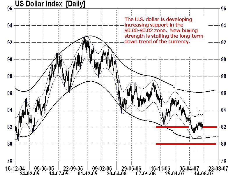 MY CONCLUSIONS: Gold and Silver stocks normally enter summer months with listless performance. This seasonal pattern appears to be developing earlier this year. Technical evidence indicates weakness throughout June and July for precious metal stocks and the expectations of testing lower levels. On a brighter note, this sector typically begins to strengthen in September and a wave of advancing prices develops throughout the 4th quarter. However, with a solid historical support zone now clearly underneath the U.S. currency, the trading action of the dollar throughout the rest of 2007 will likely be the main deciding factor for the direction and extent of any growth in gold stocks.