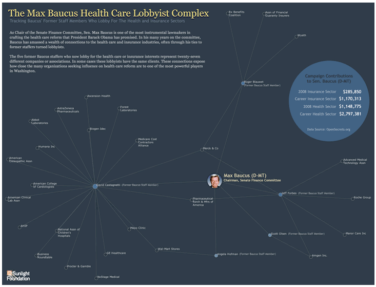 Baucus might feel he owes the industry some favors since he has received more than $5,000,000 from healthcare lobbyists since 2008. Clearly, Baucus has been bought off, similar to most others in Congress. Baucus just happened to get the biggest payout.