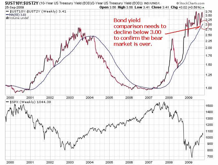 Bottom line: The US yield curve provides a valuable timing tool to the S&P 500. Though the movement of the curve sometimes lags the stock market by as much as six to eight months, its data adds confirmation to a new trend in equities. The ratio needs to fall below 3.00 before the yield curve can provide substantiate evidence of the longer-term advance in stocks.