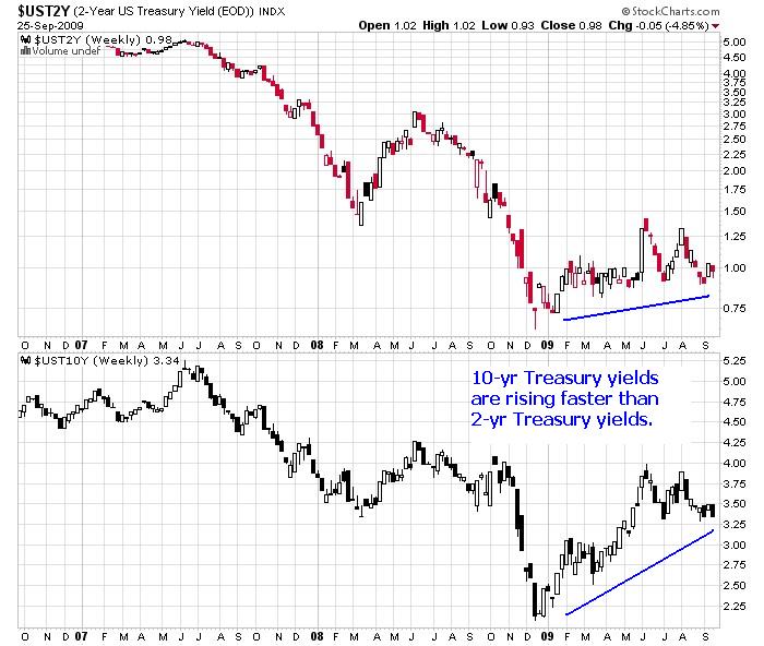 Over the past two decades, the US yield curve has been a very reliable indicator to the major peaks and troughs in the stock market. The periods in which the curve is steepest correlates closely to the bottom of the bear market. The opposite develops at market tops. When the yield curve is flat, this occurs at the top in the bull market.