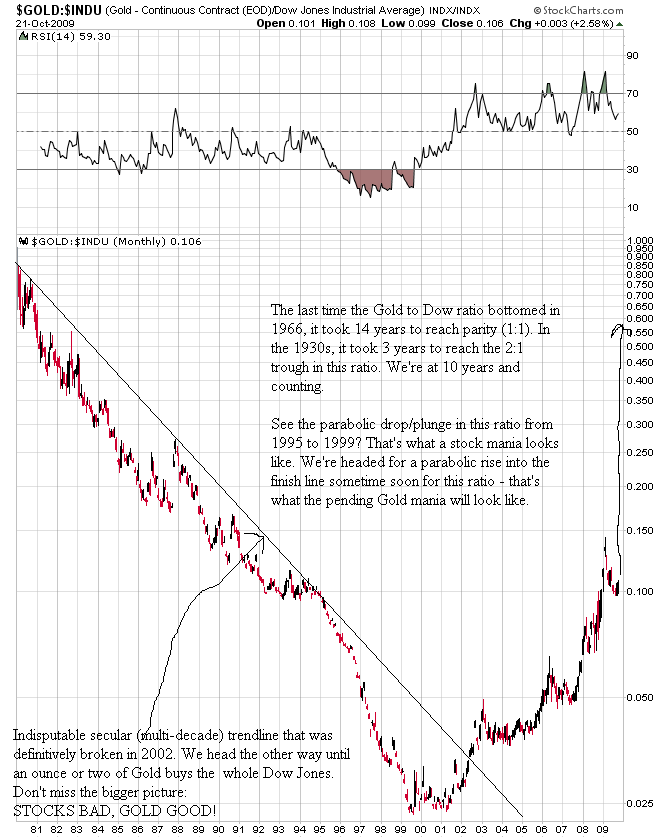 We are in a long-term secular stock bear market in inflation-adjusted terms that is far from over and we are in a long-term Gold bull market in stock market terms that is far from over. In other words, forget the nominal prices of Gold and the Dow Jones (or S&P 500, etc.) for a minute. Concentrate on the ratio of Gold to the Dow Jones and take a peek at this tremendously bullish 29 year monthly chart of the Gold price divided by the "price" of the Dow Jones Industrial Average: