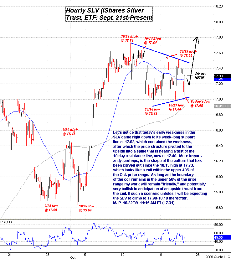 More importantly, perhaps, is the shape of the pattern that has been carved out since the 10/13 high at 17.73, which looks like a coil within the upper 40% of the Oct. price range. As long as the boundary of the coil remains in the upper 50% of the prior range my work will remain "friendly," and potentially very bullish in anticipation of an upside thrust from the coil. If such a scenario unfolds, I will be expecting the SLV to climb to 17.90-18.10 thereafter.