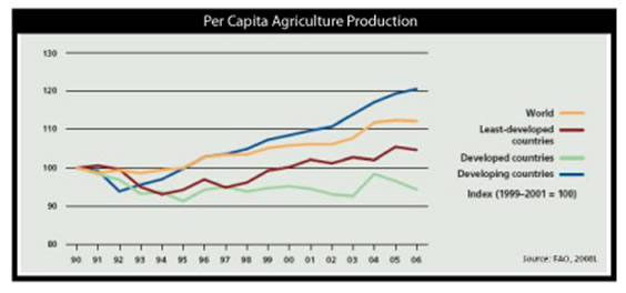 The chart above shows world agriculture production has increased a paltry 12% in the past two decades.