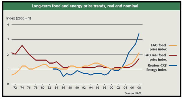 For instance, the FAO found “nominal food prices doubled between 2002 and 2008. Energy prices, led by crude oil, began rising earlier, in 1999, and have trebled since 2002.”