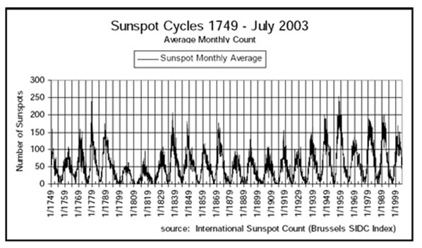 The relationship of the sun spot cycle to agriculture is not some new-fangled theory though. In his book Financial Astrology, David William’s states, “In 1875, English economist William Stanley Jevons…announced a correlation in the fluctuations in the prices of wheat, barley, oats, beans, peas, vetches, and rye with [the] sunspot cycle.”