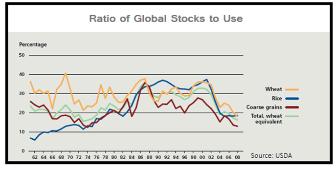As the chart below reveals, stockpiles are at record lows for wheat, rice, and coarse grains: