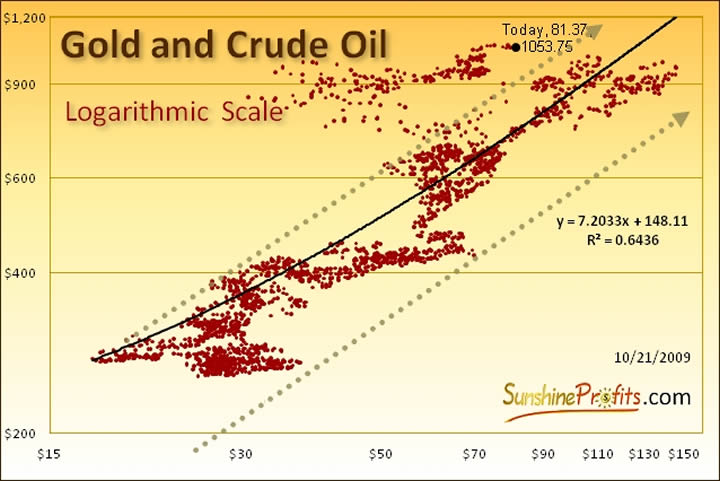 Since crude oil is so vital to the modern economy, it should not surprise anyone that it influences many markets, and virtually none of them can be completely free from oil’s influence. Therefore, this week I will analyze this particular market, from the precious metals perspective. I will use the scatter chart in order to focus on the trend and the average shape of the correlation.