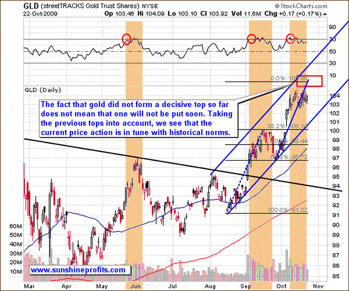 The question that I’m often asked recently is how low would the correction take us. The answer is that although the September correction did confirm the breakout, the size and significance of the move suggests that a one more re-test of the previous high of $1,033 is likely, but nobody can rule out a decline to $1,000. The media buzz that was caused by gold breaking into four digits caused many momentum chasers to enter the market that don’t want to stay in it for longer. As soon as the rally runs out of steam (for instance we will see declining volume during days when PM rise), they will dump their gold and silver positions thus igniting the decline.