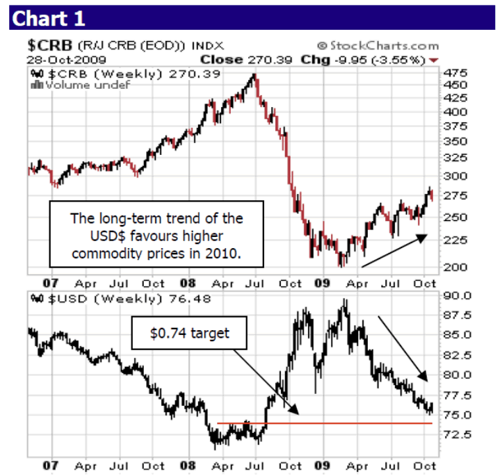 In the October newsletter, I indicated that commodities where being driven, not by fundamental demand (although it is slowly returning), but by the power of the falling US Dollar. The title for the October Commodities page sums the pattern up: “Dollar down, CRB up”. Natural resource demand will build after the global business cycle bottoms, which is expected in Q1. So investors who focus on raw materials need to closely watch the trading direction of the USD$. Chart 1