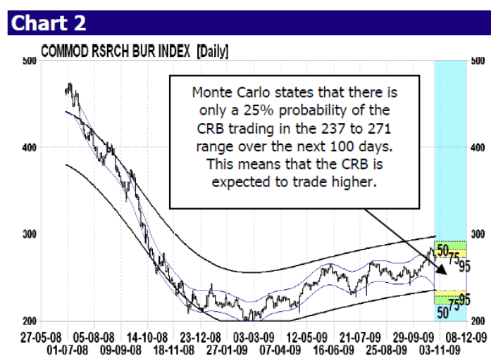 Probability models for the CRB (Chart 2) suggest some consolidation within the primary up trend can be anticipated this month. Monte Carlo simulation states there is only a 25% chance of the index trading in the 237 to 271 range over the next 100 days.