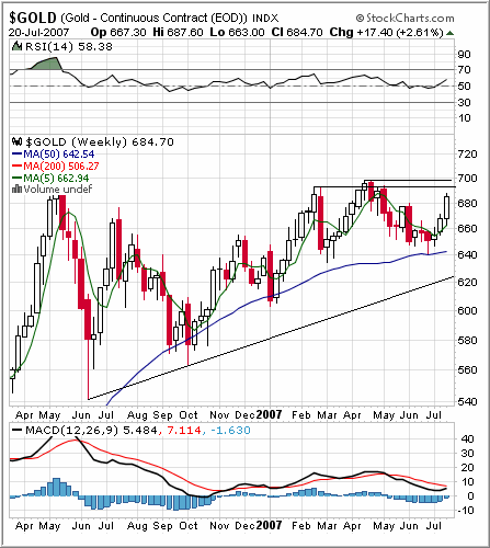 “There is strong overhead resistance in gold, first at $680 and again just below $700, but over the past year every consecutive weekly close above the 5-week moving average has signaled a move to a new high… Silver resistance lies overhead near $13.40 and again just below $14. If we really start rolling, the possible target for this move is near $14.50.” ~ Precious Points: Are Metals Next?, July 14, 2007