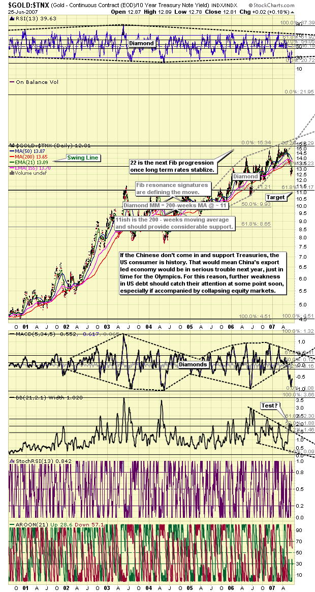 Furthermore, and as implied in our note on the attached directly above concerning what happens every time the 50-weeks moving average is penetrated, it appears authorities intend to break gold down in July using rising 10-Year rates as the trigger, undoubtedly hoping this causes a channel break, and subsequent fall down into the $550 area, the channel bottom. And they may be successful in this regard, who knows, where if Dave is right about the TNX heading to 6-percent , this would mean Fibonacci related support on the Gold / TNX Ratio at 11ish would not hold, and considerably lower prices could ensue. How do we know this attack will come as we move into July?