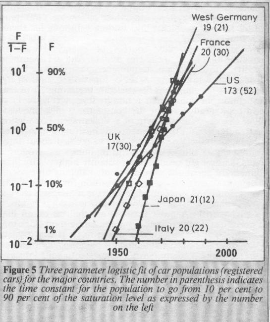 Here is a chart of market penetration of the motor car market as shown by Cesare Marchetti as it was in 1985. Note how the market for motor cars in most Western countries other than the USA seemed to be approaching saturation just at the time that the Volterra Lotka model was forecasting peak oil to arrive.