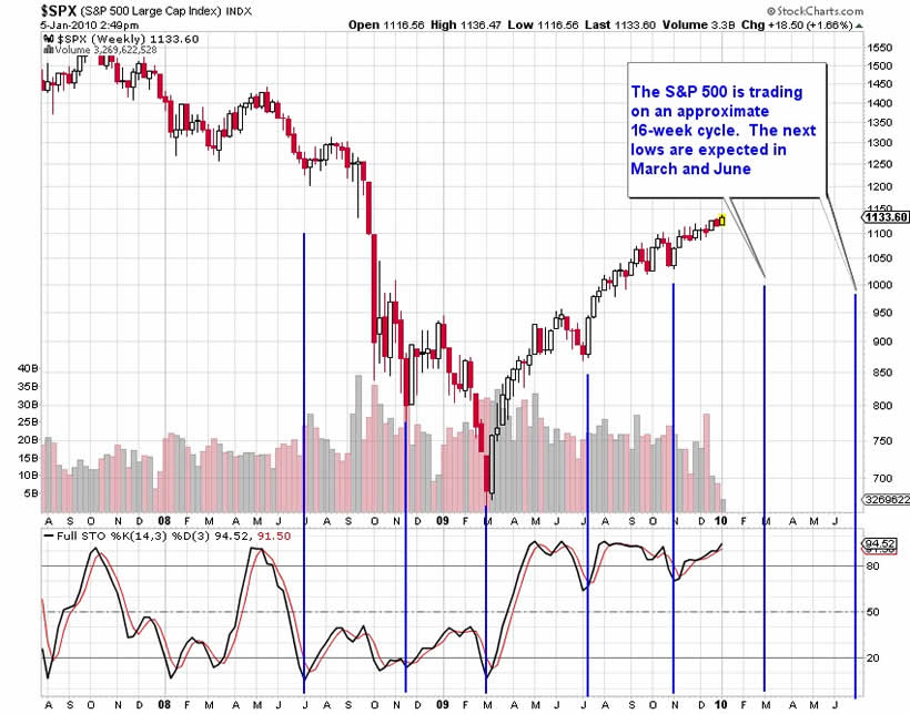 Longer-term models (Chart 2) suggest a similar pattern. As the S&P 500 nears the resistance line at 1230, there is an increasing probability of consolidation occurring. Models highlight that the index is trading on an approximate 16-week cycle. Minor pullbacks developed in March, July and November 2009. This would suggest that the next two key troughs should form in March and June. These troughs are not expected to be deeper than 10%. No technical evidence at this point predicts a greater correction. The longer-term picture suggests a slower climb into mid-2010.
