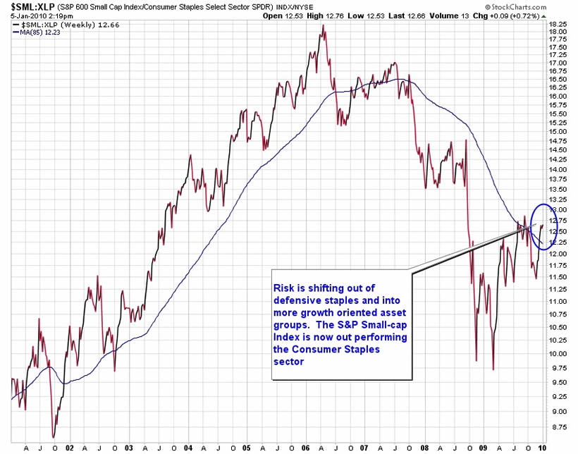 Chart 3 is a graph of the relative performance between two of those important groups. The chart illustrates how the performance in the growth oriented small cap sector began to advance over the safety of consumer staples in 2002. This transfer continued until 2006 when money started flowing out of higher risk S&P 600 Small Cap Index and back into the defensive staples industry group. That pattern remained in place until 2009. Investors once again began transferring capital into the higher risk small cap companies and out of the safety of staples. Chart 3 illustrates that the trend toward growth and risk by late 2009 had clearly changed away from the safe haven consumer staples.