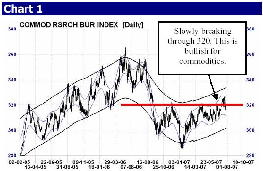 The CRB Index attempted to cross the 320 level many times in 2007, but without success. World demand for commodity prices, though strengthening, had simply not recovered significantly until mid-year.