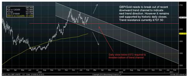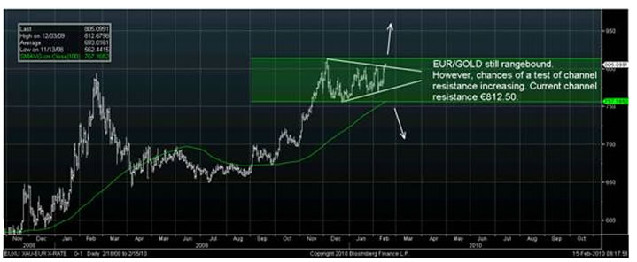Fiscal problems in the Eurozone continue to dominate and have seen the Euro remain under pressure, especially versus gold. Gold closed last week above the important psychological level of €800/oz which is bullish from a technical point of view. Given the degree of the fiscal problems in the Eurozone the likelihood that it will take months (if not years) to recover from these problems, gold should challenge its record nominal high of €813/oz and then the next psychological level of €850/oz.