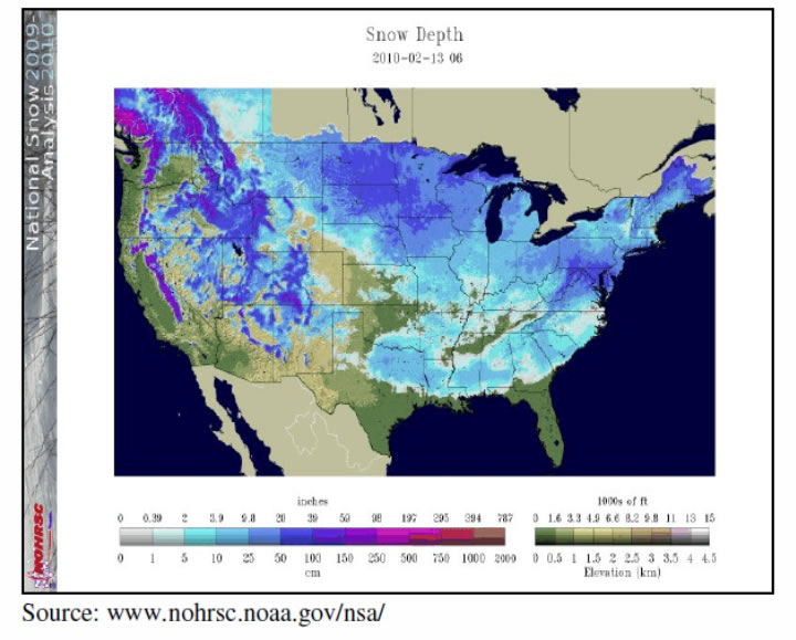 Our first chart this week, above, comes from the U.S. National Oceanic and Atmospheric Administration(NOAA). That map is of the current snow coverage of the U.S. Darker and harsher the color, the deeper is the snow on the ground. We will let you decide whether to use inches or metric. As is readily apparent, a goodly part of the Midwestern United States is covered with snow, thanks to global warming.