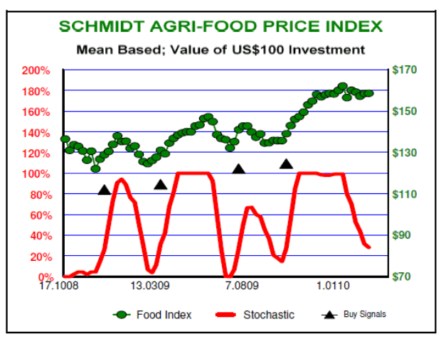 While prices rose to exaggerated levels during the hedge fund mania, that influence is now a historical note. Today Agri-Food prices are being driven by, one, demand, and, two, a general global shortage of food. That combination should lead to a continuing pattern of higher lows and higher highs, already evident in that chart.