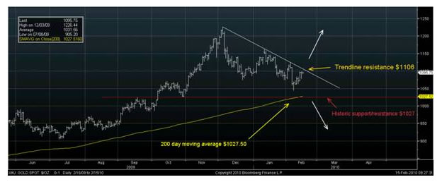Gold is well supported by oil steady near $75 a barrel (NYMEX March 10) and the dollar having weakened to 80.17 on the US dollar index. Markets continue to focus on sovereign debt issues in the Eurozone and Dubai’s debt woes are have also resurfaced (see News below). The meeting of finance ministers of the full 27-nation European Union with Greece expected to be top of the agenda may give guidance to markets. Investors fear a Greek default could spark a wider European debt crisis, threatening the ability of governments internationally to borrow money.