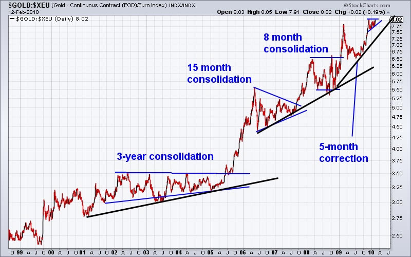 In the case of Gold/Euro, we see a market that is ready to go parabolic. The market has had four major corrections and each one has been shorter then the last. See the chart below.