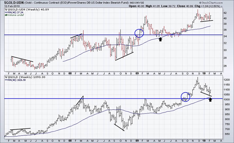 Notice how Gold/UDN made its major breakout in January while Gold achieved its breakout in September. If the relationship continues then we’d expect Gold to trade in a tight range for about four months and then begin a new advance to new highs.