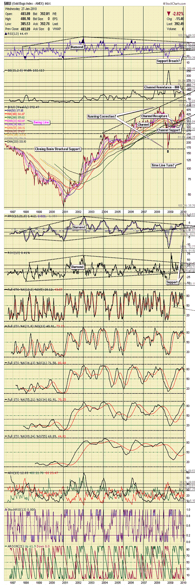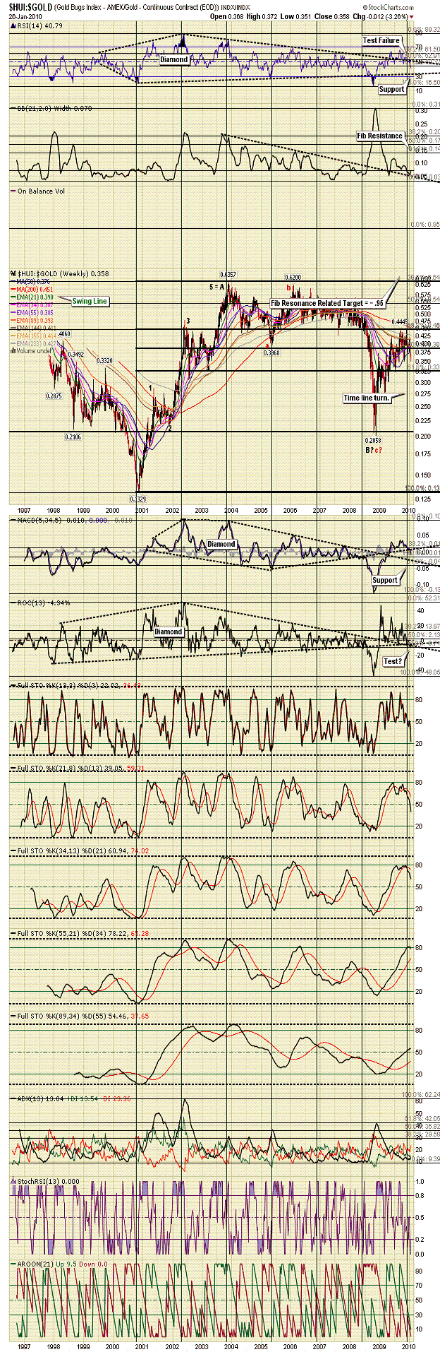 As you can see above, it appears the Amex Gold Bugs Index (HUI) is destined to test channel support in the 375 area in coming days, where unfortunately for the bulls, it may not hold. I say this for several reasons, not the least of which being because the HUI / Gold Ratio appears destined for lower trajectories as well, with indicator breaks to the downside portending further meaningful weakness. All we need is for the HUI to break the 200-day moving average with some gumption and the process would begin, which is exactly where prices are perched now. In terms of the HUI / Gold Ratio, what the bulls don’t want to see is Bollinger Band (BB) widths continue to widen with further weakness, as this would confirm the trend change from up to down with an accelerating move. Additionally, the bulls don’t want to see the RSI diamond broken to the downside again either, which is a possibility now that the bullish test has failed coincident with what could possibly be a bearish time line turn. Notice the possibility for the time line turn in the HUI (Figure 1) as well. (See Figure 2)