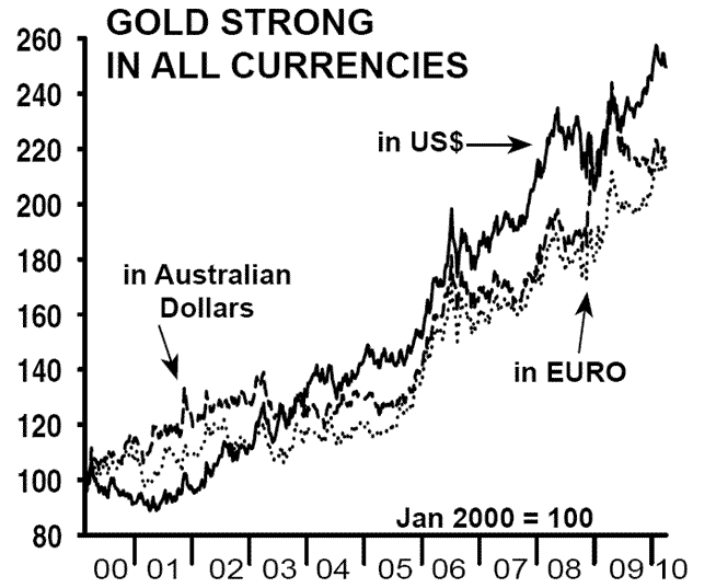 Gold is money. It’s the currency of last resort when monetary times are difficult. So when gold rises in all currencies, as it’s been doing for several years, you know the rise is enduring and superior (see Chart 1). So even though gold has no yield or earnings to measure like the other markets do, it has true value.