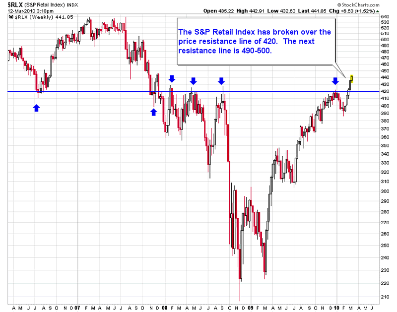 In the February newsletter I highlighted the consistent upward strength of the S&P Retail Index. This leading indicator of consumer confidence and thus economic health, had consistently outperformed many industry sectors throughout 2009 and also the broad-based S&P 500. Fundamental data generally looked unimpressive last year and many market watchers doubted the return of this important industry.