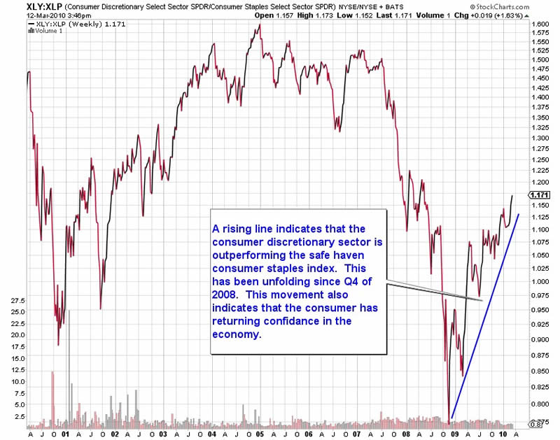 By mid-2009, the consumer discretionary sector was vastly outperforming the consumer staples group. During the last bear market (2000-2002), discretionaries were also outperforming staples. The bear market low was in October 2002 and the swing to consumer 'wants' began in 2001. This transfer is one of the first signs of a recovering economy.