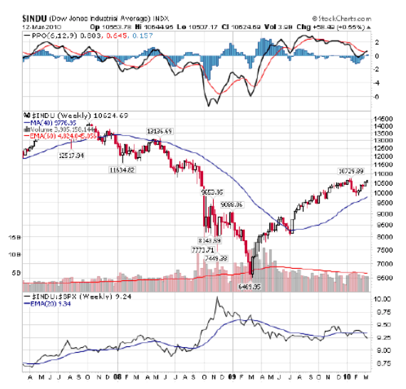 The American stock market is still working through a consolidation phase following the magnificent run up since March of last year. The Dow transports have presented us with a new Dow buy signal but so far the Industrials have unconfirmed. The Dow 30 needs to break the 10,700 range convincingly before I will advise student clients to re-enter the market through their virtual portfolios.