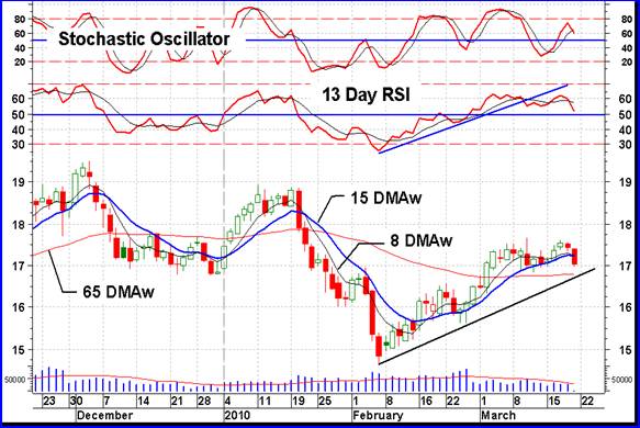 As for the normal indicators, the price moved above the short term moving average line during the week but didn’t stay there long. It’s back below the line and the line slope has turned downward. The momentum indicator has once more dropped below its neutral line into the negative zone. It is also below its negative trigger line. As for the daily volume activity, that has been below its 15 day average volume all week, including during the early week up days, suggesting weakness in the earlier up move. The short term rating is BEARISH.
