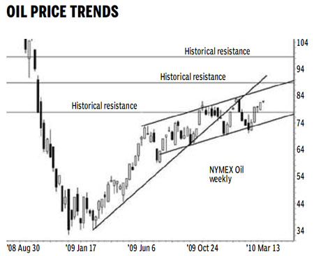 The parabolic trend is a result of a particular grouping of emotional behaviors. The current behavior seen on the chart of NYMEX oil does not include a parabolic trend but it does include patterns that provide a guide to the emotional thinking of the market. Better price chart analysis helps understand the status of the commodity and its economics, and the status of the market for the commodity. It suggests there is increased probability oil will move towards $100 during 2010.
