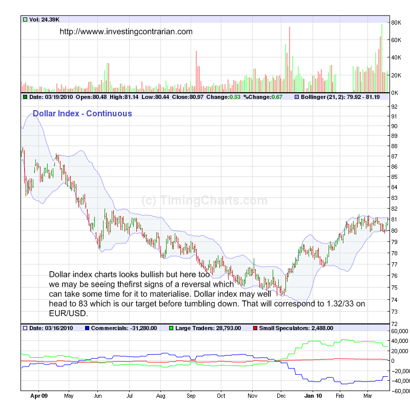 Dollar Index looks bullish but the large speculators have started to get tired of the rally and moving out. In my view there is one last leg left for the dollar to hit 82.5/83 before resuming its trend down.
