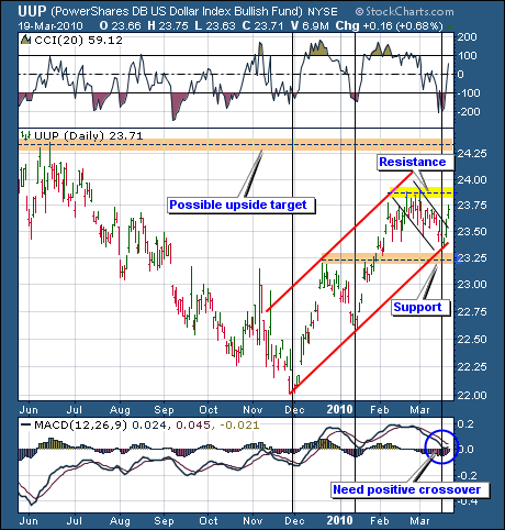 The daily UUP (dollar) chart shows the dollar breaking out and above its falling flag formation (+1.4% wk +3.7% y-t-d). Support was tested and held, and now resistance is about to be tested. Notice that a positive MACD crossover has not yet occurred, and is needed for confirmation. It is possible that the breakout fails. As of now the path of least resistance appears up.